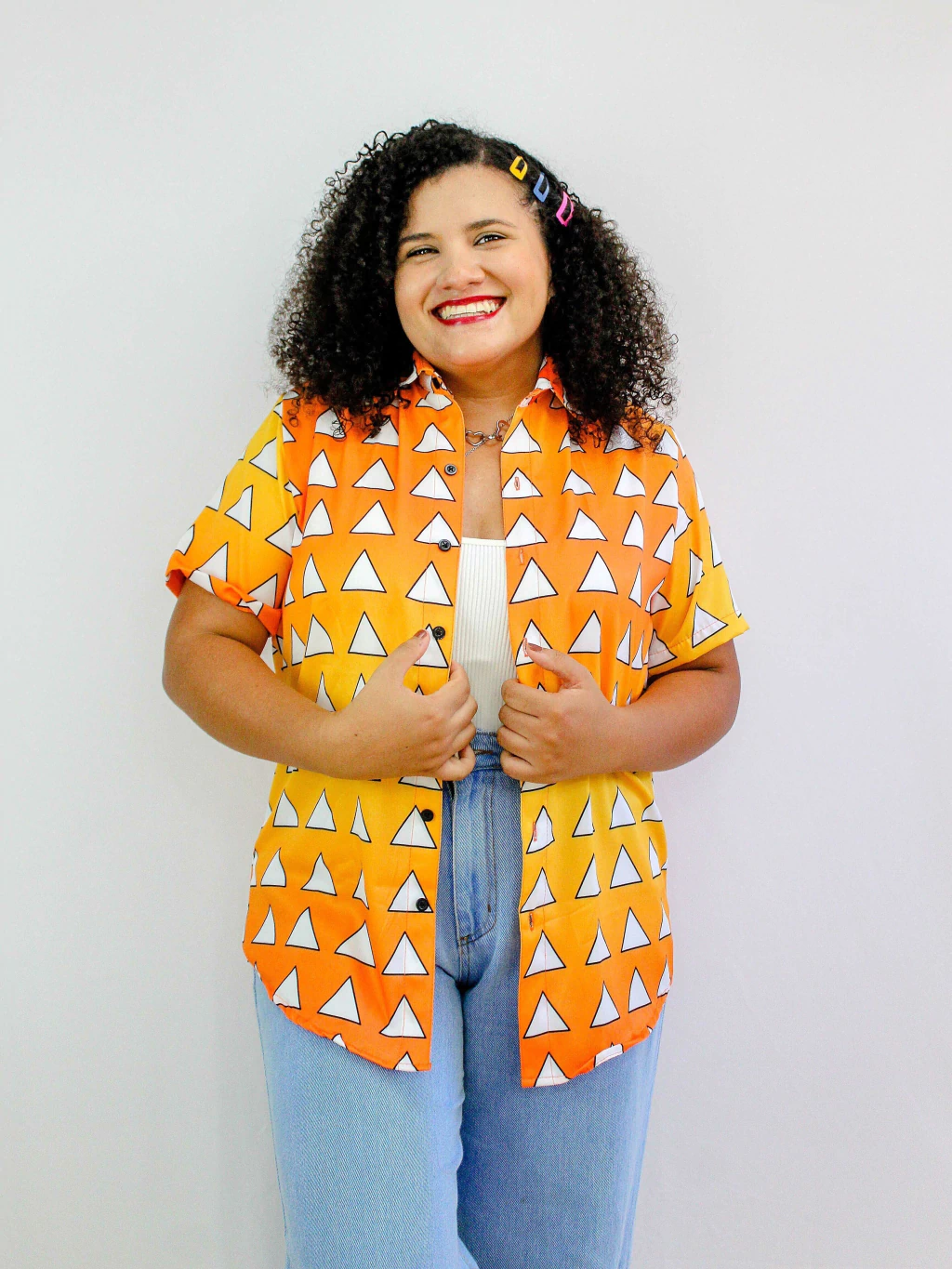 Prepare-se para brilhar com a Camisa de Botão estampada no icônico padrão amarelo com detalhes geométricos que remetem ao visual marcante do kimono de Zenitsu. Uma peça estilosa, vibrante e cheia de atitude para quem busca unir moda e cultura otaku em um só look!